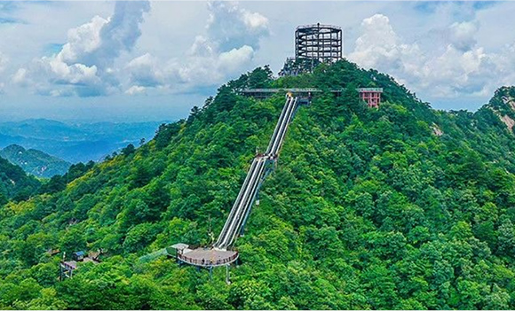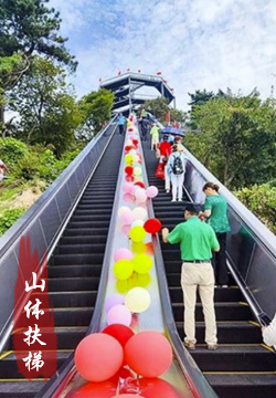 龟峰山景区山体扶梯位于花海四环线,运行线路从四环线入口攀升到四环线山顶,采用手扶式双向并联扶梯组。扶梯全长168米,提升高度68米,往返级数1314级,运行速度0.5米/秒,接待量为6000人/小时,由上下三段6部户外电梯组成,其间设三个休息平台可供游客休憩观景、摄影打卡等。