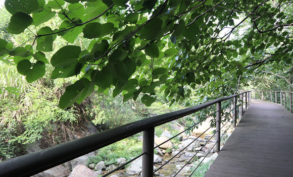龟峰峡位于距景区北门1.5公里处,是一处由峭壁所围住的山谷,因河流长时间侵蚀而形成。整个峡谷没有一步台阶,全程为蛇形栈道盘石而上,栈道全程约4Km。峡谷的形成,经历了很漫长的时间,而最美风景在险峰,峡谷的险、峻,更是难得的美景。这里的空气湿度50%,负氧离子含量更是高达上千个,令人神清气爽、心旷神怡。峡谷内不仅风景秀丽,就连瀑布都是成双成对。行走峡谷间,四周随处可见的彩绘设计令人眼前一亮,形象逼真的彩绘宛如一道道美丽的风景画令人沉浸其中,有一种回归大自然的感觉。