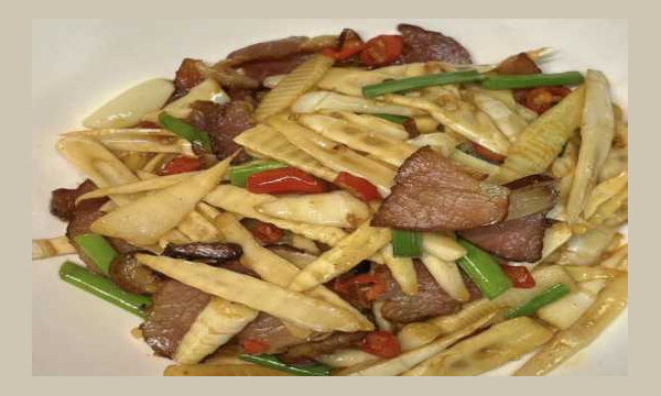 龟峰山景区龟峰客栈选用的食材多以绿色健康的农家山野菜为主,菜品形式多样,与时下流行的“康养”主题保持一致。野山笋炒腊 肉是传统名菜之一 ,以腊肉和野山笋为主料的一道美食 。春雨过后 , 山间竹林中 ,春笋便破土而出 ,这是来自山间竹林中的极品美味 ,也是麻城人 记忆里家乡的味道 ,更是外地游子春天的乡愁!