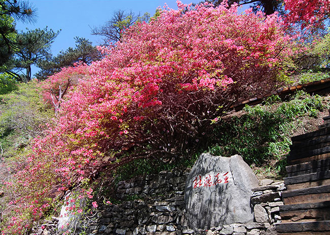 在浩瀚的杜鹃花海中,静立着一株树龄逾六百年的“杜鹃花王”。它生机蓬勃,次生枝干共56枝,枝径多在6至10厘米之间,树冠直径达6米,覆盖面积约35平方米,蔚为壮观。2009年,景区为这株花王投保960万元,寓意深刻——象征着在中国960万平方公里的土地上,56个民族同根共祖、血脉相连。同年,龟峰山古杜鹃群落成功获得上海大世界吉尼斯“面积最大的古杜鹃映山红群落”认证。这棵花王,不仅是大自然的生命奇迹,也是民族情感的生动载体,与十万亩花海共同书写着龟峰山的生态传奇与文化篇章。
