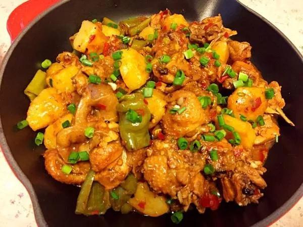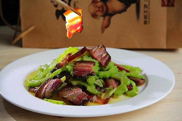 Main dishes: braised eggplant with beans and beans, roasted chicken with potatoes, fried bacon with bitter melon,