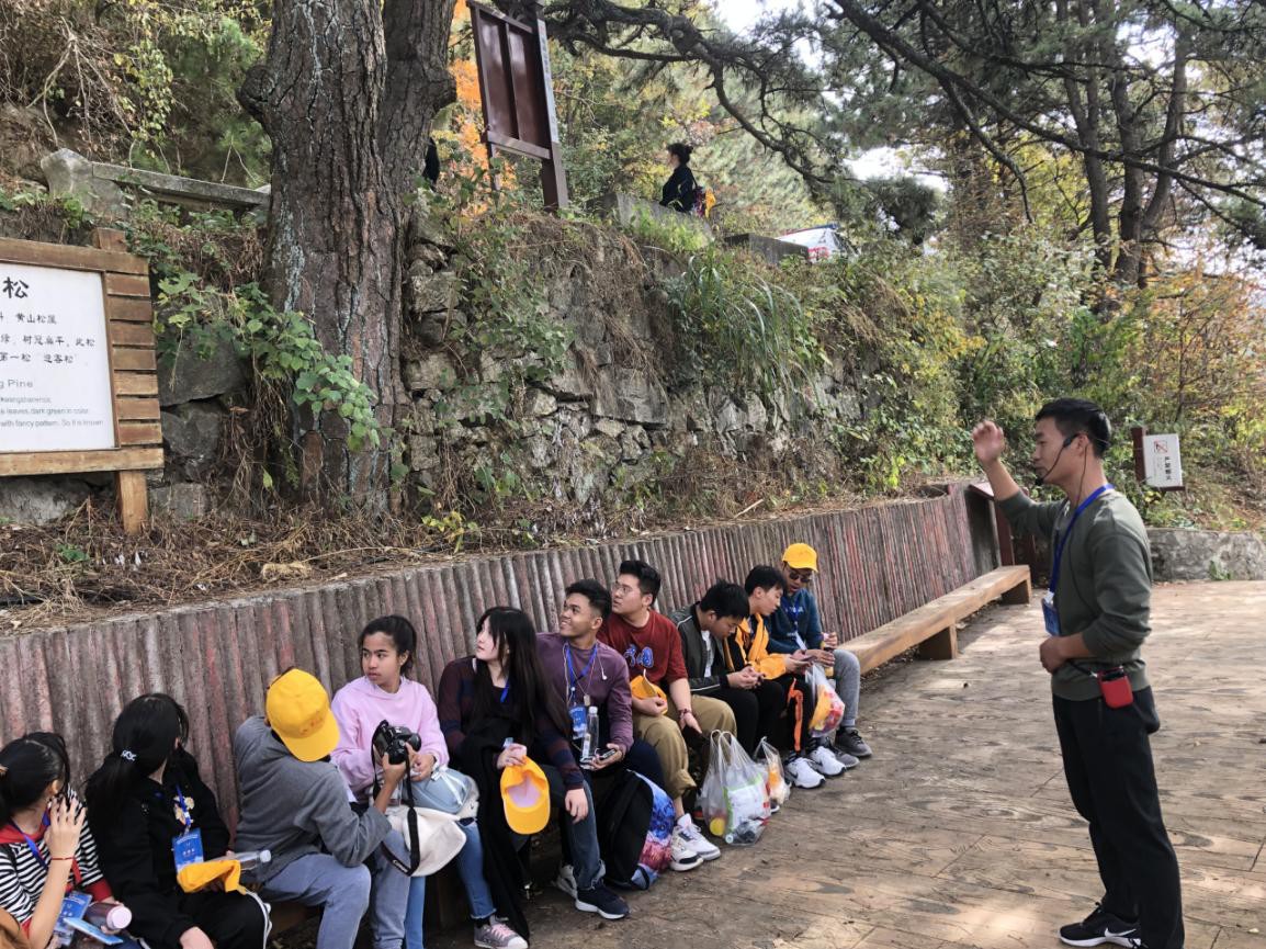 导游李帅热情的为同学们讲解着这棵象征着百万麻城人对远道而来的朋友表示热烈欢迎的松树。