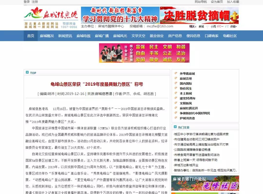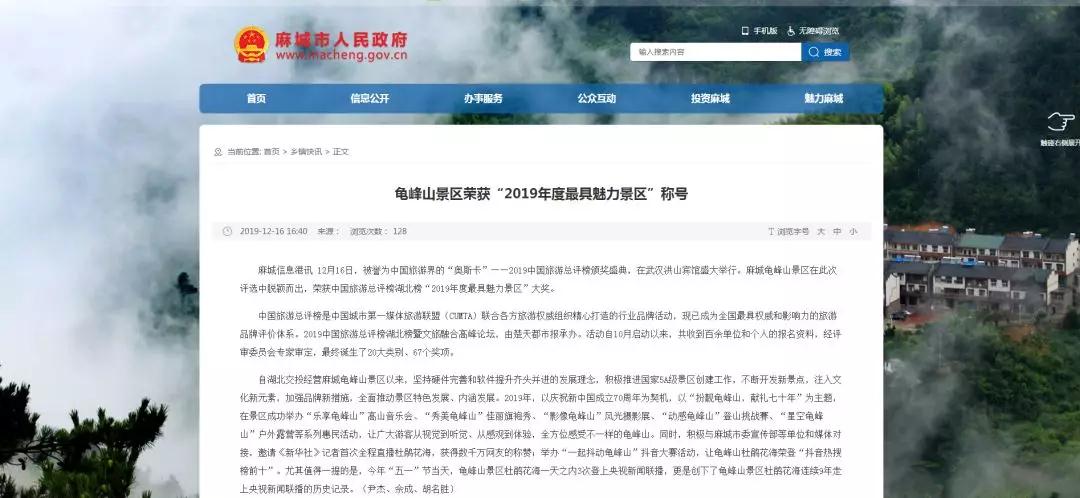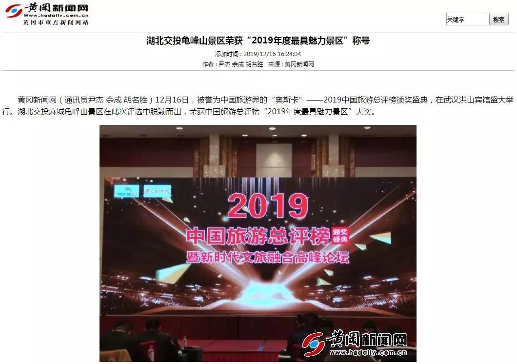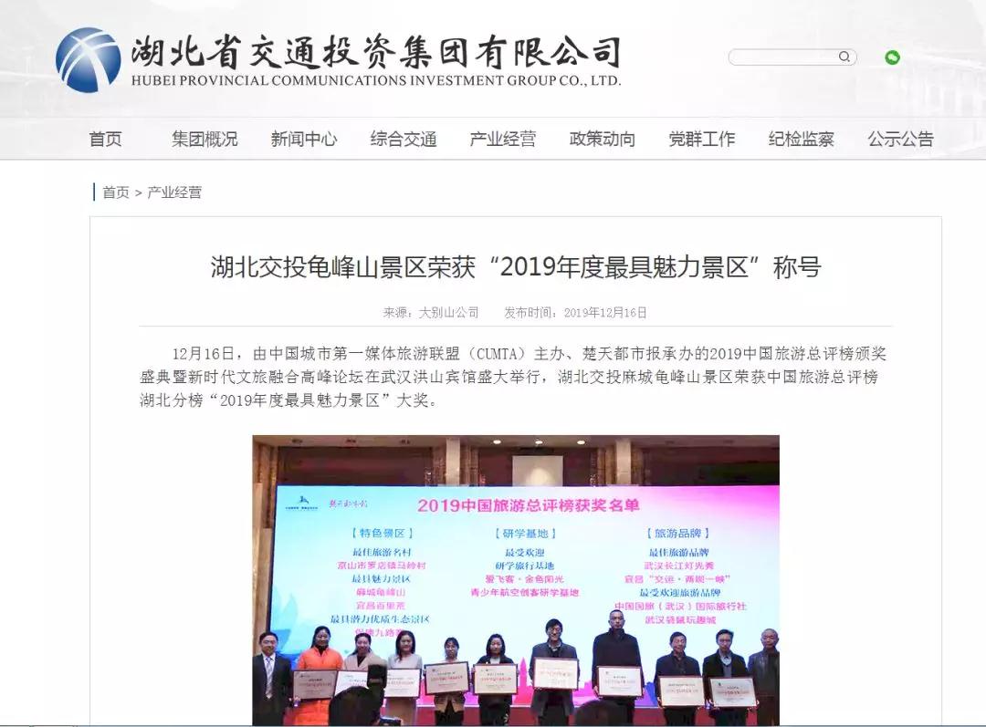 12月16日,被誉为中国旅游界的“奥斯卡”——2019中国旅游总评榜颁奖盛典,在武汉洪山宾馆盛大举行。湖北交投麻城龟峰山景区在此次评选中脱颖而出,荣获中国旅游总评榜湖北榜“2019年度最具魅力景区”大奖。