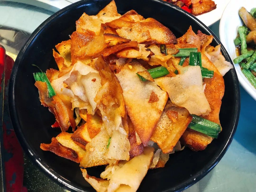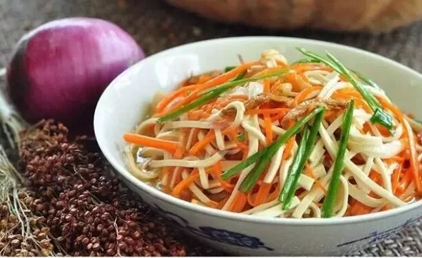 这个菜通常是宴席上第一个上桌的菜,主料是千张,麻城的千张跟别处不同,吃起来软而柔和,有种豆制品的清香。千张切丝入锅,加入食用碱沸水煮一下,然后和五花肉、胡萝卜丝、黄花菜一起炒,清香扑鼻。